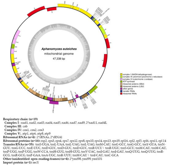 From the obtained long-read sequences, we assembled the mitochondrial genome (mtDNA) of the A. euteiches ATCC201684 strain. As depicted in Figure 4, the circular genome is 47 kb in size and is predicted to encode 40 protein-coding genes, 4 ribosomal RNA genes and 35 tRNA genes (Table S1f). The genes are encoded by both strands. As previously reported for mitogenomes of oomycetes [61], a bias in A/T usage is observed for the GC content around 22%. Using the available mitochondrial genome information (Table S1g), we compared the mitogenome content of A. euteiches with those of two other Saprolegniales (Aphanomyces astaci and Saprolegnia ferax) and one Peronosporale (Phytophthora infestans). The mitogenome size of A. euteiches is similar to that of the other Saprolegniales and larger than that of Peronosporale (e.g., 39.8 kb for P. infestans vs. 46.9 kb), as previously reported [50,62]. The gene content of mtDNA from A. euteiches is similar to those in other Saprolegniales and Peronosporales. A duplication of ribosomal RNA is observed in the Saprolegniales when compared with P. infestans (4 vs. 2). A secY gene that encodes for the central subunit of the secretory channel SecYEG, which enables the secretion of proteins across a membrane in their unfolded version, is present in the mitogenome of A. euteiches as it is in the other oomycetes.