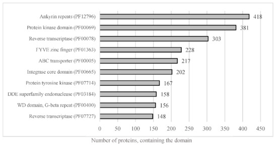 Representation of the most abundant PFAM predicted domain in the proteome of A. euteiches. When considering the number of proteins containing the most-present PFAM domains in total proteome, of the 23,027 total predicted proteins, around 56% harbor a PFAM domain.