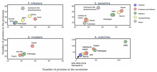 To gain an overview of the A. euteiches secretome’s composition and compare it with that of the other oomycetes, we identified and annotated the secretomes of two Saprolegniales, namely, the fish pathogens Aphanomyces invadans and Saprolegnia parasitica, and the distant Peronosporale plant pathogen Phytophthora infestans (Table S2a–c). We searched for the most represented PFAM-containing proteins and divided them into five classes (>15 proteins per class, Table S2d). The carbohydrate-active enzymes (CAZymes) class included secreted proteins that play a role in polysaccharides’ degradation in the host as well as in remodeling the oomycete cell wall. The protease and inhibitors class included secreted proteolytic proteins that take part in the alteration of the host immune system and in protecting against host lytic enzymes. The adhesion class comprised secreted proteins with adhesive capacity to different substrates such as cellulose and chitin and/or catalytic activity. The toxicity/elicitors class corresponded to secreted proteins that are known to trigger a host response or to be toxic to the host cells (i.e., elicitins, NLPs). The class labeled ‘others’ included all other secreted proteins known to play a role in host interaction (i.e., calcineurin-like phosphoesterase, tyrosinase). CRN and SSP families were not included in the analysis due to the absence of PFAM domains in a large majority of these proteins. Figure 6 presents the PFAM-containing proteins in the whole-proteome in each class with respect to the number that is expected to be secreted (Table S2k). We observe that a common trait of the oomycetes’ secretome is the ‘proteases and inhibitors’ class, which presents the most-enriched terms in Saprolegniales and Peronosporales with respect to the total protein content, but this is not the case for A. euteiches. The ‘adhesion’ class is a common trait among the four oomycete species, with an enrichment of PAN-Apple-containing proteins within this category such as the CBEL cell wall glycoprotein of Phytophthora sp., which contributes to plant adhesion and the cell wall architecture [63]. Overall, we notice that the phylogenetically distant P. infestans presents a distinctly different secretome profile compared to Saprolegniales species, characterized by the enrichment of toxic/elicitors proteins and protease-inhibiting Kazal domains. The Saprolegniales species, despite their different host preferences (plants vs. fish), show common features in their secretome profile such as enrichment in both adhesion domains and in several proteolytic domains. A. euteiches and S. parasitica secretomes seem more diverse in terms of their PFAM domains related to the different classes, as compared to A. invadans, and present an increase in proteolytic enzymes included in the ‘protease and inhibitor’ class. The A. euteiches secretome is also highly enriched in carbohydrate-binding proteins, especially with respect to proteins containing cellulose-binding domains (CBM1); this high number is a distinguishing feature that stands out when compared to the other species. Finally, the secretomes of plant pathogens share the CAZymes class as a unique and common feature.