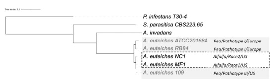Phylogenetic relationship between the six sequenced A. euteiches strains. The maximum likelihood tree was built using Species Tree from All Genes (STAG) method from OrthoFinder. A. euteiches, S. parasitica and P. infestans were used as outgroups of different degrees of relativeness. MC1 and NC1 were identified as race 1 and race 2 (hatched square) based on their virulence on the Saranac and WAPH-1 alfalfa genotypes, while the ATCC201684, RB84 and Ae109 strains (grey square) were included in the ‘pathotype’ based on their aggressiveness against a pea collection. The geographical origins of the strains are indicated.