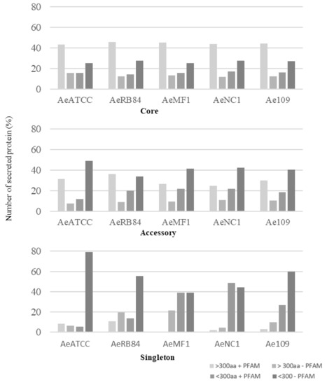 Size distribution of secreted proteins in the core, accessory and singleton secretomes of A. euteiches spp. A. euteiches spp. secreted proteins with (+) or without (−) a predicted PFAM domain are classified in two categories based on their size: larger than 300 amino acids (>300 aa) or less than 300 residues (<300 aa).