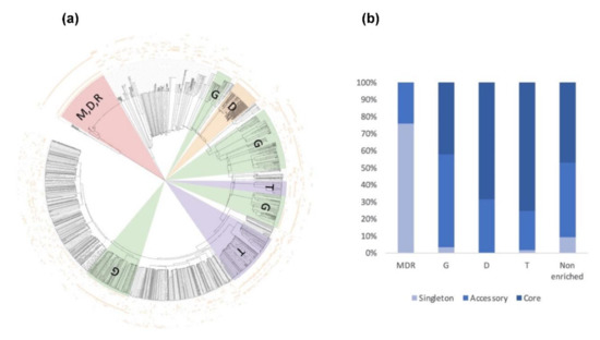 Consensus tree and class distribution of small, secreted proteins (SSP) within five strains of A. euteiches. (a) UPGMA consensus tree of 2010 SSPs from five strains of A. euteiches (RB84, Ae109, MF1, NC1, ATCC201684) based on whole protein amino acid sequence alignment using ClustalOmega (inner circle). Outside circles represent amino acid enrichment with one amino acid per circle (color = enriched, blank = non-enriched value). Colored ranges represent SSP classes with similar amino acid enrichment patterns. Green = G-rich, orange = D-rich, purple = T-rich, pink = MDR-rich. (b) Distribution of SSP classes (G-rich, D-rich, T-rich, MDR-rich, non-enriched) between core, accessory and singleton secretomes (in percent) of A. euteiches.