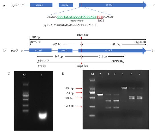 Schematic illustration of sequence information and in vitro Cas9 cleavage assay. (A) Sequences of the sgRNA targeting pyrG are shown in green font, which were located at exon3. Sequence direction was 5′-3′ as shown. Schematic representations of exons are drawn to scale. The protospacer adjacent motif (PAM) is shown in red. (B) Fragments required for the in vitro Cas9 cleavage assay were amplified with primers FfpyrG-1F/FfpyrG-1R and FfpyrG-4F/FfpyrG-4R. The red triangle represents the cleavage site of Cas9. The annealed products of crRNA and tracrRNA (C) and cleavage assay of Cas9 nuclease in vitro were visualized using agarose gel electrophoresis (D) M, DL 2000 marker; 1, sgRNA products; 2, pyrG-578 bp without RNPs; 3–4, pyrG-578 bp with RNPs; 5, pyrG-902 bp without RNPs; 6–7, pyrG-902 bp with RNPs.