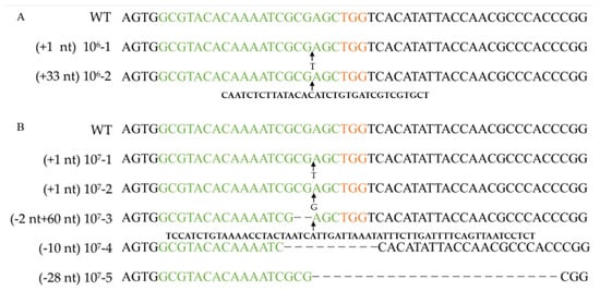 The pyrG genes of 16 F. filiformis transformants were sequenced, all of which exhibited expected mutations in the vicinity of the cleavage site (Figure 3, Figure 4 and Figure S1). Sequence analysis of the transformants with insertions revealed that the inserted fragments, 115 bp and 47 bp, were consistent with the genome sequences of JAJAKW010000006.1 and JAJAKW010000005.1, respectively [Fv01-10_genome GenBank assembly (GCA_022345005.1)]. The other two inserted fragments of transformant 106-2 and 107-3 were not able to align with the genome of F. filirormis.