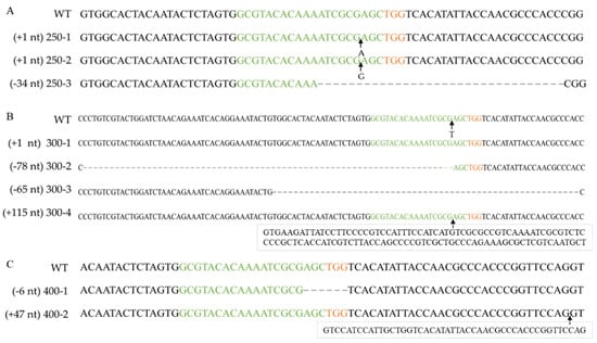 Verifying pyrG mutation after RNP-based gene disruption using different RNP concentrations. Alignment of pyrG sequences and corresponding mutants obtained by transformation with 250 nM RNPs (A), 300 nM RNPs (B) or 400 nM RNPs (C). WT: wild-type strain Dan3. Concentrations 250-1~250-3, 300-1~300-4, 400-1~400-2: mutants generated by transformation of RNPs. Green marked represents spacer sequences; orange marked represents PAM.