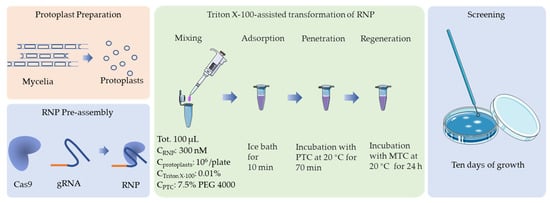 Different gradients (0, 0.005%, 0.01%, 0.15%, 0.2%, and 0.3% [w/v]) of Triton X-100 were prepared to screen its optimum concentration. Triton X-100 is a chemical reagent that can improve cell membrane permeability to ensure RNPs cross the fungal cell membrane and nuclear membrane successfully [20,21].