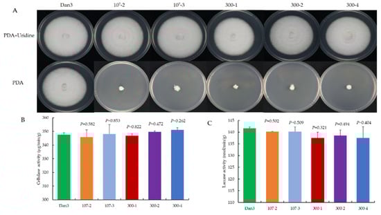 As a genetic manipulation toolbox, the application of such a tool should be avoided to cause phenotypic changes. To ensure that the transient introduction of RNPs would not disrupt the expression and function of other genes, the morphology and important phenotypic traits—such as growth and cellulase activity—of the selected F. filiformis transformants, which had undergone pyrG mutagenesis, were compared with those of the parental strains. The mycelial growths of five randomly selected RNP-directed mutants were observed on potato dextrose agar (PDA) medium, with or without uridine, after 7 d of incubation. On PDA plates without uridine, only the prototrophic strain Dan3 grew normally; the other five mutants showed defects in mycelial growth. By contrast, the growth of the mutants on PDA plates containing uridine was not affected (Figure 6A). No significant differences in cellulase and laccase activity were observed among the RNP-directed mutants and the wild-type Dan3 strain (Figure 6B,C).