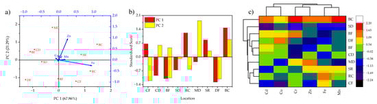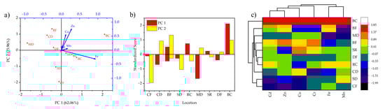 (a) Axial biplot; (b) PCA-standardized scores; and (c) HCA dendrogram with heatmap for heavy metal contents in P. ostreatus collected from different locations of Rajaji National Park, Haridwar, India.