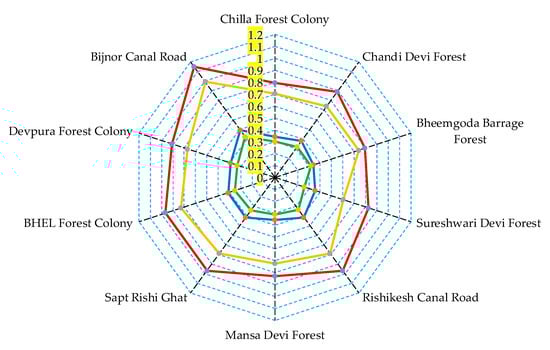 For P. djamor, the following child HRIs trend was noted: Bijnor Canal Road > BHEL Forest Colony > Sapt Rishi Gat > Rishikesh Canal Road > Devpura Forest Colony > Bheemgoda Barrage Forest > Chandi Devi Forest > Mansa Devi Forest > Chilla Forest Colony > Sureshwari Devi Forest. Whereas, adult HRIs had the following decreasing order: Bijnor Canal Road > BHEL Forest Colony > Sapt Rishi Gat > Rishikesh Canal Road > Devpura Forest Colony > Chandi Devi Forest–Bheemgoda Barrage Forest > Mansa Devi Forest > Chilla Forest Colony > Sureshwari Devi Forest. The obtained findings simulate that HRI values were not only species-related, but also soil-related (mainly Cd contamination). Other recent studies outlined the strong inter-relationship between soil mercury (Hg) content and HRI values in wild edible mushrooms [40,43,44]. Thus, the THQ approach in the current study was helpful to estimate potential health risks associated with consumption of heavy metal contaminated Pleurotus spp.