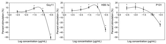 Percent stimulations of mycelial growth were expressed by the following formula. Percent stimulation (%) = [(mycelial diameter of the treated − diameter of mycelial plugs) / (mycelial diameter of the control − diameter of mycelial plugs) − 1] × 100%. Results were represented as the mean values ± standard deviation. One-way analysis of variance (ANOVA) with a least significant difference (LSD) test in SPSS software (version 21.0; IBM SPSS Inc., Chicago, IL, USA) was used to evaluate the significant differences between treatments.