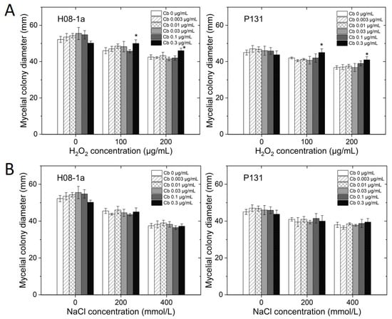 Determination of sensitivity to H2O2 and NaCl were assayed according to the previous studies [22,24]. Inverted 5 mm mycelial plugs of isolates H08-1a and P131 removed from 7-day-old colonies were inoculated on PDA amended with carbendazim at 0, 0.003, 0.01, 0.03, 0.1, and 0.3 μg a.i./mL. Mycelial colonies grown on PDA amended with different concentrations of carbendazim were incubated at 28 °C in darkness for 7 days as the pretreatment. Inverted mycelial plugs cut from carbendazim pretreatment colonies were transferred to PDA media amended with H2O2 at 0, 100, and 200 µg/mL, or NaCl at 0, 200, and 400 µg/mL. The diameter of mycelial growth was measured after incubating at 28 °C for 7 days. There were at least 4 replicates for each treatment and the experiment was repeated three times independently.
