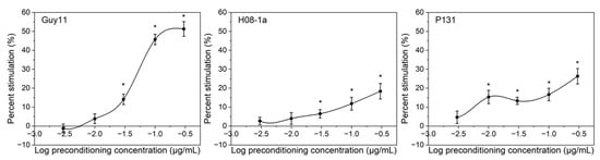 As for the mechanism of hormesis, direct stimulation or an overcompensation to a disruption of homeostasis may be two mechanisms responsible for hormetic dose–response [39]. In a previous study which reported that herbicide phosphinothricin stimulated growth of plant Lotus corniculatus L, a mechanism of direct stimulation for chemical hormesis was reported. Lower concentrations of herbicide activated the chloroplast isoform GS2, causing growth stimulation, while higher concentrations inhibited chloroplast isoforms GS1 and GS2, resulting in growth inhibition [40]. In pharmacology literature, a high amount of low-dose stimulatory responses may be relevant to the direct stimulation mechanism [41]. Some previous studies on the aggressiveness stimulations of fungicide hormesis on S. sclerotiorum or B. cinerea indicated that stimulatory effects of carbendazim [30,42], trifloxystrobin [43], and flusilazole [31] belonged to a direct stimulation mechanism. In general, overcompensation to disruption of homeostasis is manifested as early inhibition before stimulation. It was reported that a chemical stressor inhibited plant growth at 24 h but stimulated growth at 72 h [44]. In this study, the visible necrotic symptoms on rice leaves sprayed with carbendazim at 0.03 µg/mL could be observed as early as 2 DPI. The fact revealed that stimulation of M. oryzae by low doses of carbendazim was due to a direct stimulation rather than an overcompensation to disruption of homeostasis.