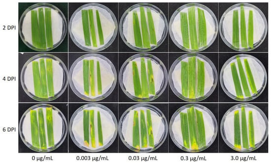 Time course of the infection process of conidia of Magnaporthe oryzae isolate Guy11 on detached rice leaves. Leaves were sprayed with carbendazim solutions at concentrations of 0, 0.003, 0.03, 0.3, and 3.0 µg/mL before inoculation of M. oryzae. DPI = days post inoculation.