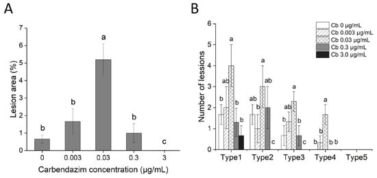 Visible necrotic symptoms could be detected at 2 DPI on leaves sprayed with carbendazim at 0.03 µg/mL, whereas no necrotic symptom could be discerned for the control (Figure 4). From 4 to 6 DPI, disease symptoms progressed faster on rice leaves treated with carbendazim at 0.03 µg/mL. Statistical results of the lesion area at 7 DPI showed that there was a significant stimulation (p < 0.05) of aggressiveness of M. oryzae isolate Guy11 on detached rice leaves at 0.03 µg/mL carbendazim, whereas 3.0 µg/mL carbendazim treatment could substantially inhibit infectious fungal growth and limit the lesion area (Figure 5A). Furthermore, the lesions were quantified by dividing the lesions into 1–5 types based on the disease severity. It was observed that 0.03 µg/mL carbendazim treatment also increased the lesions in every type (Figure 5B). Interestingly, 0.3 µg/mL carbendazim treatment could significantly inhibit the mycelial growth of M. oryzae in PDA, but promoted the aggressiveness of M. oryzae on the detached leaf to a certain extent.