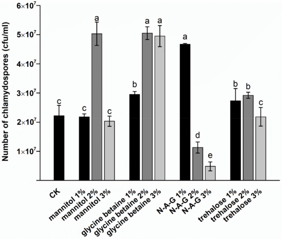 Effects of different exogenous regulators on the chlamydospore yield. N-A-G: N-acetylglucosamine. The data are from three independent repeated experiments. The different letters above the bars indicate a significant difference in the chlamydospore yield for each treatment, according to the least significant difference test (p < 0.05).