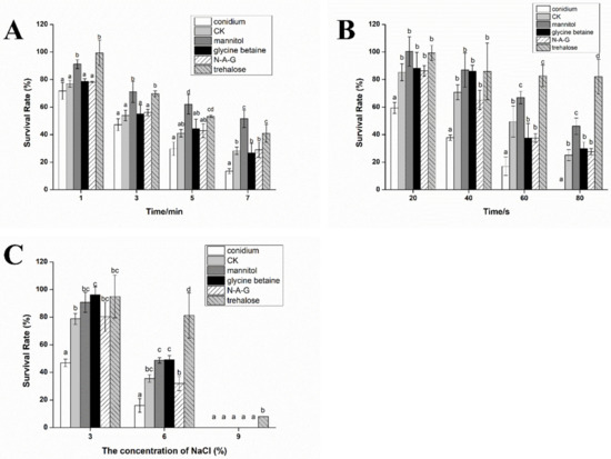 We verified the tolerance of chlamydospores induced by different exogenous regulators to UV, heat, and hypertonic stresses. After heat treatment for 7 min, the survival rate of the conidia was only 13.50%, whereas the survival rate of the chlamydospores in all groups was higher than that in the conidia group. Furthermore, compared to the ordinary chlamydospores produced in the control group, the survival rates of chlamydospores in the mannitol and trehalose treatment groups were 51.57% and 40.92%, respectively, which were significantly higher than those in the other groups (Figure 2A).