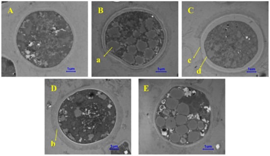 Transmission electron microscopy (TEM) images of chlamydospores: (A) control, (B) mannitol, (C) glycine betaine, (D) N-A-G, and (E) trehalose. The scale bar is 1 μm. (a) Fat droplet, (b) diffuse outer layer, (c) outer wall, and (d) inner wall.