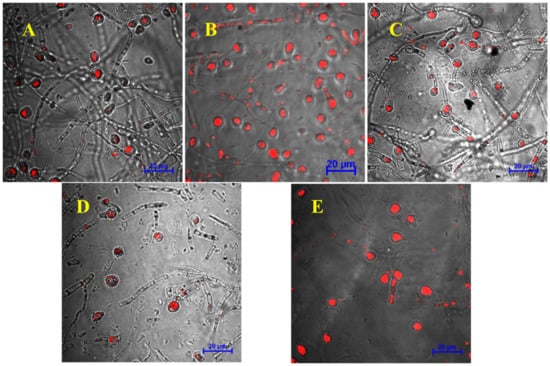 Images of chlamydospores produced by adding different exogenous regulators, as observed under a confocal microscope: (A) control group, (B) mannitol, (C) glycine betaine, (D) N-A-G, and (E) trehalose. The scale of the image is 20 μm.