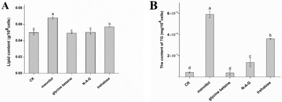 Therefore, we measured the lipid content in chlamydospores and found that mannitol and trehalose significantly increased lipid accumulation compared to the control group. The total lipid content increased by 36.27% and 14.23% after the addition of mannitol and trehalose, respectively, compared to the control group. Glycine betaine and N-A-G had no significant effect on the lipid content (Figure 5A). We found that the TG content of the control group was 4.25 × 10−5 mg/104 cells, whereas the TG content after mannitol and trehalose treatment was 5.90 × 10−4 mg/104 cells and 3.63 × 10−4 mg/104 cells, respectively; it was 13.88 times and 8.54 times higher than that in the control group (Figure 5B).