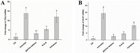 Differences in the expression of genes related to lipid metabolism caused by different exogenous regulators: (A) TGL2 gene and (B) OLE1 gene. The data are from three independent repeated experiments. The different letters above the bars indicate a significant difference in the expression level of the TGL2 gene and the OLE1 gene for each treatment, according to the least significant difference test (p < 0.05).