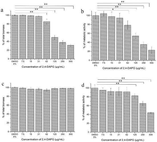 Influence of 2,4-DAPG on the C. albicans ATCC 10231 biofilm development (a,b) and on the mature biofilm (c,d). 2,4-DAPG action was estimated by measuring biofilm biomass (a,c) and metabolic activity of the biofilm-embedded cells (b,d). The y-axis represents percentages calculated with respect to the control sample. The means plus standard deviations of results from two independent experiments with three technical replicates are shown. Values that are significantly different from the values for “DMSO 5%” are indicated * p < 0.05, ** p < 0.01 (pair-sample Student’s t-test).