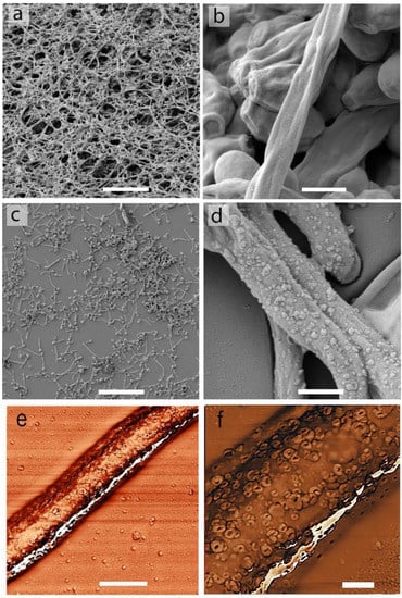 Microscopy investigations of C. albicans biofilm. Representative SEM images of the intact biofilm structure (a,b). SEM images of the biofilm formed in the presence of 2,4-DAPG (250 µg/mL) (c,d). Representative AFM images (phase shift mode) of hyphae treated with 2,4-DAPG (250 µg/mL) (e) and enlarged area of hyphae surface with protrusions (f). Scale bars—50 µm (a,c); 2 µm (b,d,e); 200 nm (f).