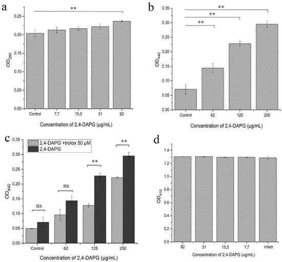 The protease activity of planktonic cells (Sap1–3) (a) and biofilms (Sap4–6) (b) of C. albicans ATCC 10231 under the influence of different concentrations of 2,4-DAPG. Trolox addition (50 µM) reduced Sap production (c). Lipase production was not affected by the action of 2,4-DAPG (d). The means plus standard deviations of results from two independent experiments with three technical replicates are shown. Values that are significantly different from the values for “control” are indicated ** p < 0.01, ns—values are not significantly different (pair-sample Student’s t-test).