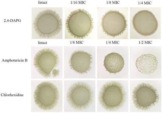 To evaluate the inhibition of germ tubes on a solid medium, 10 µL of the inoculum suspension of C. albicans, adjusted to 106 CFU/mL, was spotted on Spider agar plates containing different concentrations of 2,4-DAPG and control antimicrobials (amphotericin B (Sigma-Aldrich, St. Louis, MO, USA) and chlorhexidine bigluconate). The plates were incubated for 4 days at 37 °C, then the morphology of the fungal colonies was observed using a stereomicroscope and photographed using a digital camera.