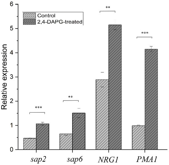 The stress-response of Candida cells to the treatment was evaluated using real-time quantitative PCR analysis. It was found that the addition of 125 µg/mL of 2,4-DAPG to the growth medium significantly increased the relative expression of the sap2 gene (2.27-fold) as well as the sap6 gene (3.12-fold) (Figure 7). The expression level of the NRG1 gene, a negative regulator of filamentation, was 1.75 and 1.89 times higher in the treated samples than in the control one (Figure 7).