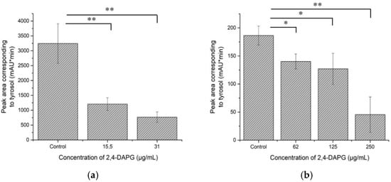 The co-incubation of forming biofilms with inhibitory and sub-inhibitory concentrations of 2,4-DAPG (62–250 µg/mL) also led to a decrease in tyrosol production (Figure 8b). 2,4-DAPG at 62, 125, and 250 μg/mL has reduced tyrosol production by 25 ± 7.1, 32 ± 14.8, and 76 ± 16.7%, respectively.