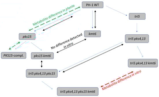 Overview of the generation of F. graminearum knockout strains and observed metabolite differences. Blue arrows indicate the strain genealogy (order of gene disruptions). Dashed arrows indicate the results of metabolite comparisons (Red: difference in vitro. Green: difference in planta. Black: no difference in vitro detected).