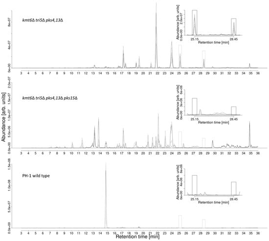 Comparison of basepeak chromatograms with m/z range 500–550 of de-repressed kmt6Δ strains #1290 and #1291 (top chromatogram) kmt6Δ pks15Δ knockout strains #2263 and #2266 (middle chromatogram) and PH-1 wild-type (bottom chromatogram) culture supernatant samples. Two additional peaks marked with boxes were found at retention time 25.1 min and 28.4 min, respectively. These were exclusively present in the chromatograms of the strains #1290 and #1291 but missing in those of the pks15Δ and wild-type strains (on minimal media).