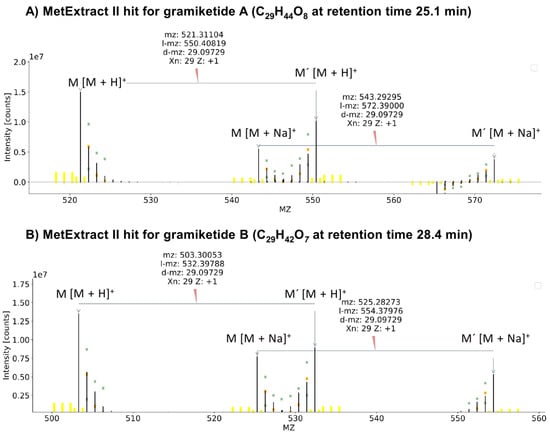 MS1 spectra of metabolite ions, identified by MetExtract II in the native/uniformly 13C labeled 1 + 1 mixed supernatant samples of strains #1290 and #1291 after cultivation in liquid minimal medium. (A) the spectrum for [M + H]+ and [M + Na]+ ions of C29H44O8 and (B) the spectrum for [M + H]+ and [M + Na]+ ions of C29H42O7, confirming the number of carbon atoms contained to be 29 in both cases.