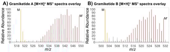 Average MS1 [M + H]+ ion spectra of gramiketide A (A) and gramiketide B (B) each showing an overlay of the native 12C isotopolog pattern (orange) and 13C labeled isotopologs with a varying number of 12C tracer units incorporated (brown). Unrelated signals are shown in gray. Peak intensities were normalized to most abundant signals of 12C and 13C isotopologs, respectively.