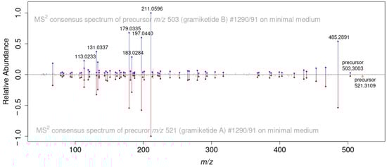 Comparison of MS/MS spectra of [M + H]+ precursor ions of gramiketide A (red) and gramiketide B (blue), demonstrating the close structural similarity of the two metabolites. Matching fragments are marked with dots.