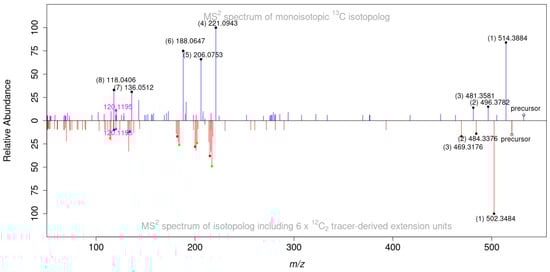 The applied reversed labeling approach allows for obtaining further structure information by comparison of MS/MS spectra of the monoisotopic U-13C29 precursor (no tracer incorporated), to those of partly tracer-enriched analogues (selected precursors are listed in Supporting material Table S3). Mass increments of corresponding molecules/fragments directly indicate the number of tracer moieties contained in the respective ion species. In the example given in Figure 6, the partly labeled intact protonated molecule contains six tracer-derived C2 extension units as can be seen from the mass shift of −12.04026 Da.