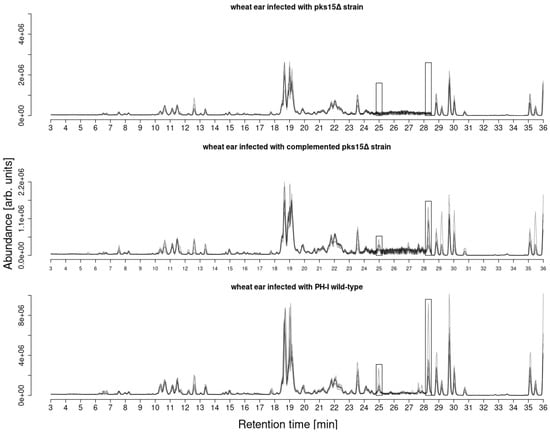 Earlier publications on FHB reported that the biosynthetic PKS15 cluster of F. graminearum is only expressed in planta under infection conditions in barley and wheat [2] but not in vitro under lab culture conditions [7]. Based on these findings, we infected wheat with different strains of F. graminearum with the aim to unambiguously demonstrate that the putative target compounds, selected from the differential comparison of F. graminearum strains #1290/91 and #2263/66 are the true products of the PKS15 derived enzyme. For this purpose, flowering wheat ears were inoculated with spores of F. graminearum wild-type strain PH-1 as well as with the pks15Δ and the complemented pks15 mutant strains for 96 h and analyzed by LC-HRMS/MS. A targeted search for the putative gramiketides A and B revealed that the identical target metabolites were produced in plants infected with both the PH-1 wild-type and the complemented strains (both containing a functional PKS15 gene), but not after treatment with the pks15Δ strain (Figure 7).