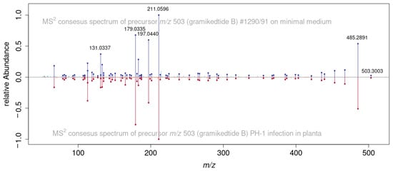 Comparison of LC-HRMS/MS spectra of gramiketide B m/z 503.3003 produced by the kmt6∆ strain in liquid minimal medium (blue) and the metabolite produced by PH-1 in planta (red) showing a high similarity (dot product similarity score of 0.984) of the spectra.