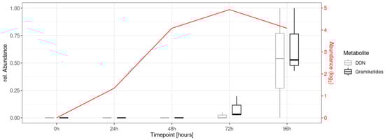 To investigate the formation of the gramiketides A and B in planta over time, LC-HRMS/MS data of an earlier time course experiment in the glasshouse were re-evaluated, in which flowering wheat ears were infected with spores of F. graminearum wild-type (PH-1) and sampled at different time points up to 96 h (five repetitions per time point). For details of the biological experiment, refer to Schweiger et al. [41]. As expected from the results described in the literature [2,42,43,44], the target metabolites were formed upon infection of wheat and were measurable with the described RP-LC-HRMS method 72 h after treatment, with concentrations further increasing over time (Figure 9).