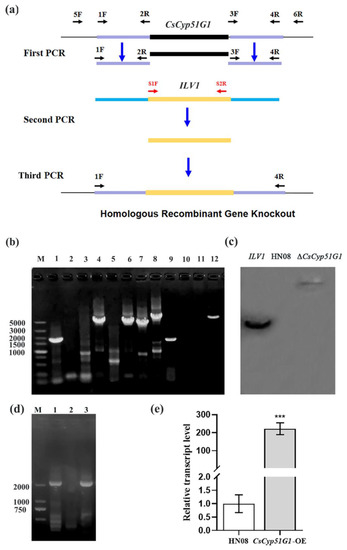 Homologous recombination was performed for CsCyp51G1 gene deletion. Primer pairs were designed as per the schematic diagram shown in Figure 1a and are listed in Table S1. First, the upstream and downstream flanking sequences of CsCyp51G1 were amplified with the primer pairs 1F/2R and 3F/4R; 2R and 3F contained the linker sequences of the chlorimuron resistance gene (ILV1). Second, the whole ILV1 gene fragment was amplified by S1F/S2R from the plasmid pcx62-S [28]. Finally, the first- and second-round PCR products were used as templates, and enriched fusion fragments were obtained by fusion PCR amplification using 1F and 4R as primers. The final fusion fragments were directly transformed into protoplasts of HN08, and transformants were screened as described by Song et al. [28].