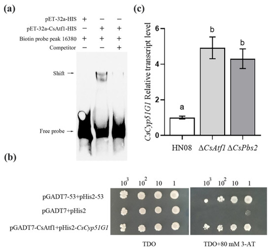 Analysis of the binding and expression relationship between CsAtf1 and CsCyp51G1. (a) Detection of the binding relationship between the CsAtf1 protein and the promoter regions of CsCyp51G1 by EMSA. +, protein added, −, protein not added. (b) Y1H Gold confirmed that the transcription factor CsAtf1 binds to the promoter of CsCyp51G1. The representative growth status of different cell culture dilutions (1:1, 1:10, 1:100, 1:1000) on SD/-Leu/-Trp/-His agar medium without and with 80 mM 3-AT is shown. (c) Relative expression analysis of CsCyp51G1 in the wild-type HN08, ΔCsPbs2, and ΔCsAtf1 strains. Different letters (a, b) represent significant difference at p < 0.01 (One-way ANOVA and Duncan’s test).