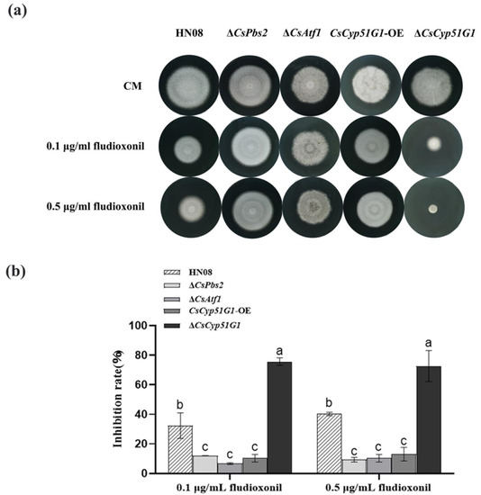 Comparison of fludioxonil resistance among the WT strain HN08, ΔCsPbs2, ΔCsAtf1, CsCyp51G1-OE, and ΔCsCyp51G1. (a) Mycelial growth of the tested strains cultured in CM containing different concentrations of fludioxonil for 5 d. (b) Growth inhibition rate of the tested strains under different concentrations of fludioxonil. The growth inhibition rate is relative to the growth rate of each untreated control [(diameter of untreated strain − diameter of treated strain)/(diameter of untreated strain × 100%)]. Three repeats were performed. The error bars show the SD value, and different letters indicate significant difference at p < 0.01 (One-way ANOVA and Duncan’s test).