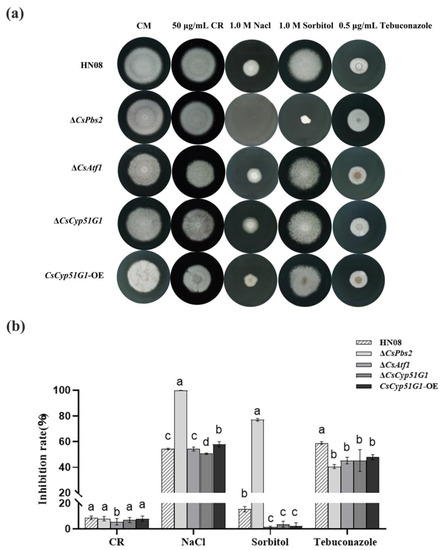 Comparison of responses to various stresses among HN08, ΔCsPbs2, ΔCsAtf1, CsCyp51G1-OE, and ΔCsCyp51G1. (a) Mycelial growth of HN08, ΔCsPbs2, ΔCsAtf1, CsCyp51G1-OE, and ΔCsCyp51G1 on CM containing 1 M NaCl, 1 M sorbitol, 50 μg/mL Congo red, and 0.5 μg/mL tebuconazole for 5 d. Approximately 1 × 106 conidia of each strain were inoculated onto the center of the CM plates and grown for 5 d. (b) Growth inhibition rates of the tested strains under different stresses. The growth inhibition rate is relative to the growth rate of each untreated control [(diameter of untreated strain − diameter of treated strain)/(diameter of untreated strain × 100%)]. Three repeats were performed. Error bars represent the standard deviations. Different letters (a, b, c, d) represent significant difference at p < 0.01 (One-way ANOVA and Duncan’s test).
