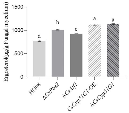Ergosterol content in HN08, ΔCsPbs2, ΔCsAtf1, CsCyp51G1-OE, and ΔCsCyp51G1. The error bars show the SD values, and different letters (a, b, c, d) represent significant difference at p < 0.01 (One-way ANOVA and Duncan’s test).