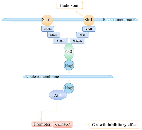 Fludioxonil is considered the main representative phenylpyrrole fungicide [14]. It is generally agreed that fludioxonil can activate the HOG MAPK signaling pathway through group III HHKs over a long period of time [15]. Brandhorst et al. proposed that fludioxonil interferes with the activity of triosephosphate isomerase, which leads to the release of methylglyoxal, resulting in activation of the group III HHKs [16]. Because the HOG pathway is responsible for cellular adaptation to environmental stresses such as osmotic stress, it is generally accepted that the fungicidal activity of fludioxonil can be attributed to disorder in osmotic signal transduction [17,18]. Based on previous studies, Kilani and Fillinger speculated that the action mode of fludioxonil may involve simulation of osmotic stress by activating the HOG MAPK pathway [14]. In Magnaporthe oryzae, recent studies have shown that although both fludioxonil and osmotic stress can activate Hog1 of the HOG MAPK pathway and transport it to the nucleus, there are differences in their molecular mechanisms [19]. However, the specific mechanism of action of fludioxonil has yet to be identified.