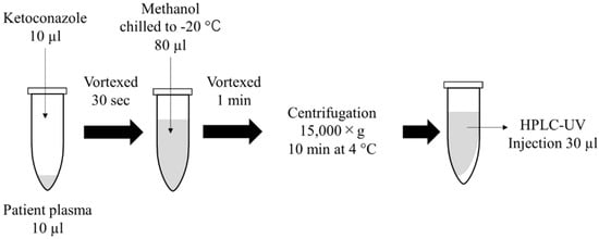 The voriconazole working solution (10 µL) was vortexed with 10 µL of plasma for 30 s in a 2.0-mL microtube (ClickFit 2.0 mL; Trerf Lab, Switzerland). Voriconazole-spiked plasma (20 µL), the internal standard (10 µL; 1.0 µg/mL ketoconazole), and methanol (70 µL) that had been chilled to −20 °C were mixed, vortexed for 1 min, and centrifuged at 15,000× g for 10 min at 4 °C. The resulting supernatant (30 µL) was used as the sample for HPLC analysis. The sample preparation method for patient plasma was shown in Figure 1.