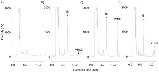 Typical chromatograms showing the determination of plasma voriconazole. (a) Blank plasma sample. Spiked plasma samples containing voriconazole (VRCZ) at (b) 0.125 µg/mL (lower limit of quantification) or (c) 5.0 µg/mL. (d) Patient plasma sample on day 22 (2.69 µg/mL).