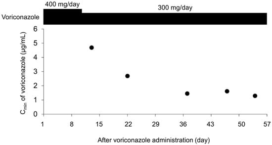 Voriconazole is a broad-spectrum triazole antifungal agent used as the first-line treatment against invasive aspergillosis []; it is also used as an alternative therapy for candidemia []. Voriconazole is also used as a prophylaxis for patients who are at a high risk for invasive fungal diseases (IFDs), such as those undergoing hematopoietic stem cell transplantation. However, voriconazole exhibits nonlinear behavior and shows considerable individual variability in its pharmacokinetic profile []. One reason for the individual variability is that poor metabolizers, owing to genetic polymorphisms of cytochrome P450 2C19 (an enzyme involved in voriconazole metabolism), have higher plasma voriconazole concentrations and are more likely to experience hepatotoxicity and other adverse events []. Moreover, plasma voriconazole concentration increases in patients with inflammatory conditions [,]. In contrast, IFDs, including invasive aspergillosis, have a poor prognosis []; thus, failure of treatment or the occurrence of breakthrough IFDs owing to low plasma voriconazole concentration must be avoided. Thus, therapeutic drug monitoring (TDM) is recommended for voriconazole [,,]. At trough concentrations (Cmin), the recommended therapeutic range for voriconazole is 1–5 μg/mL on days 5–7 (day 3 for dosage regimen with loading dose) after the first dose [].