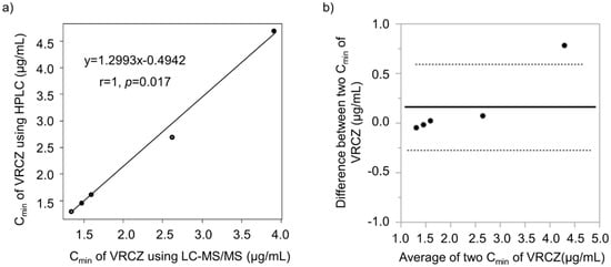 The plasma voriconazole concentrations measured on days 13, 22, 37, 47, and 54 by BML, Inc., the outsourcing vendor, using LC-MS/MS, were 3.91, 2.62, 1.47, 1.59, and 1.34 µg/mL, respectively. The Cmin of voriconazole determined using our method significantly correlated with that obtained via outsourcing (r = 1; p = 0.017). The Bland–Altman plot showed that the mean bias ± SD of voriconazole Cmin between our method and the outsourced method was 0.16 ± 0.30 µg/mL, and the limits of agreement were −0.274 and 0.594, respectively (Figure 4b).