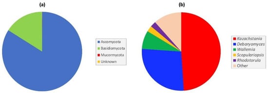 One hundred and thirty fungal taxa were classified to phylum level (97%), with the majority (95%) resolved to the genus level, and seventy-six of these (57%) to the species level. Four taxa could not be assigned at the phylum level or below and were classified as ‘Unidentified’ (Table S3). At the phylum level, >99% of fungi belonged to either Ascomycota or Basidiomycota, with a single taxon assigned to the Mucormycota subphylum (Figure 1a), with Ascomycota the predominant phylum accounting for 83% of all fungal reads (Figure 1a). In all, 85 taxa were ascomycetes, 44 were basidiomycetes, and one was identified as a mucormycete (Mucor saturninus) (Table S3).